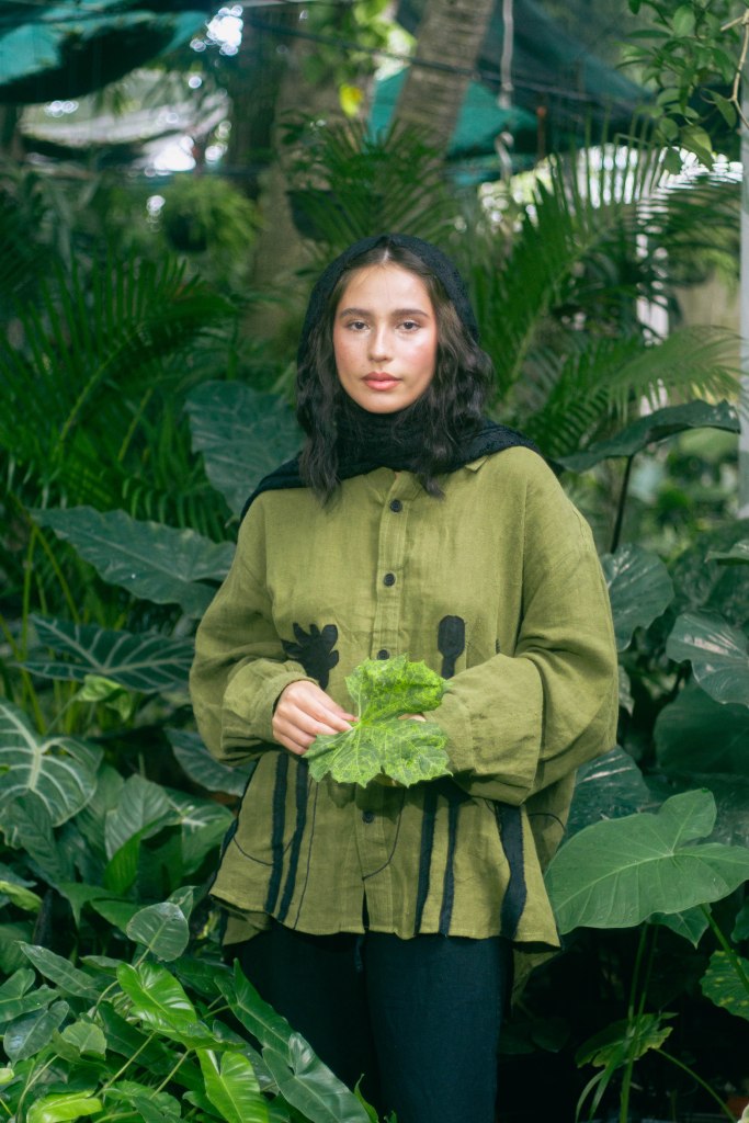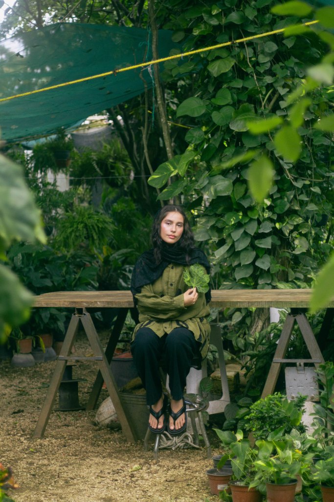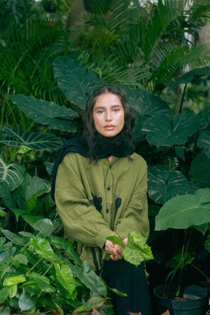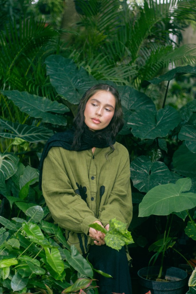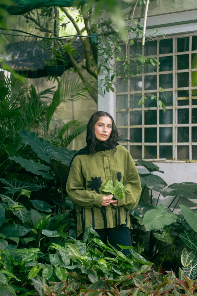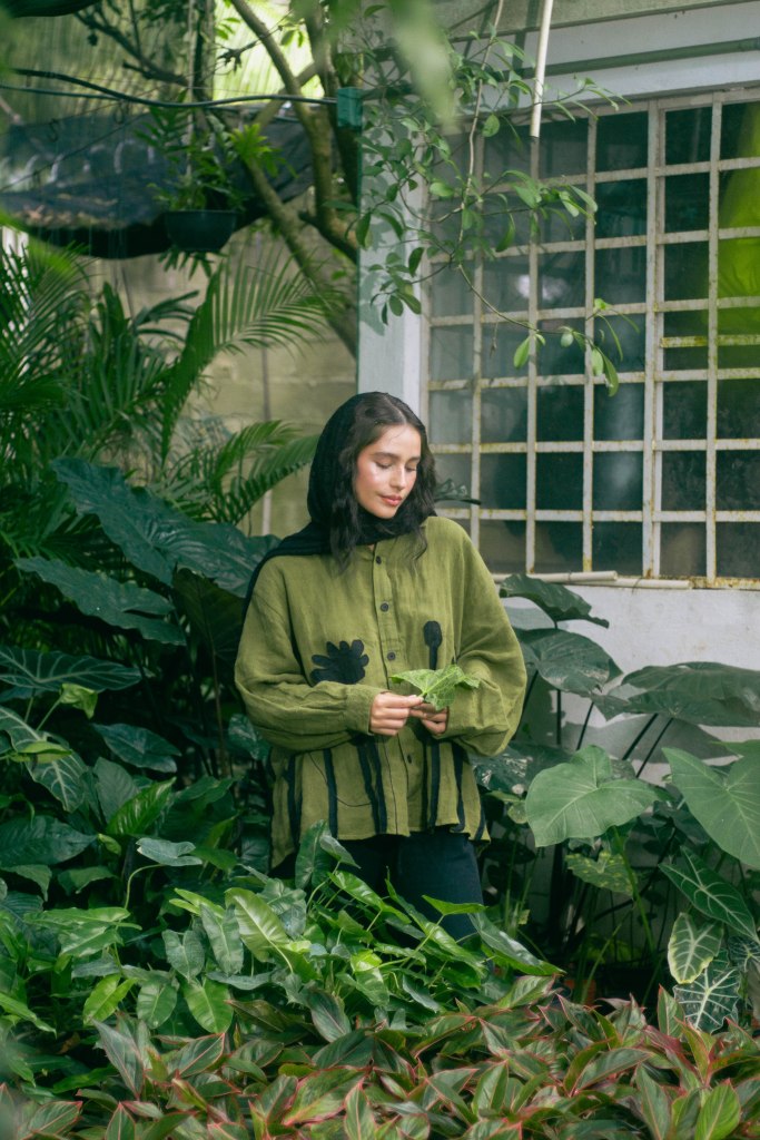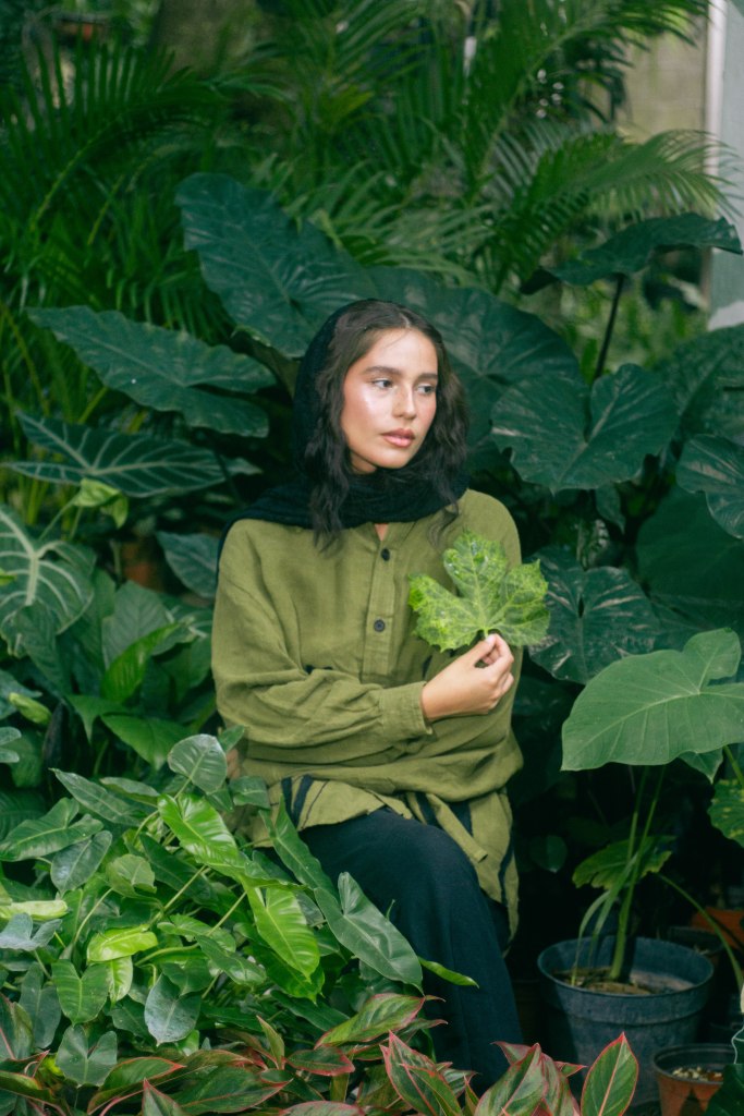 La idea fue centrarla a ella al momento de encuadrar y enmarcarla con las hojas en primer plano, para tenerla siempre rodeada de verde, como si la envolviera y ella fuera parte de la naturaleza. Con esta misma intención escogí que la prenda principal, la camisa verde con detalles negros en forma de plantas, para ayudar a que el personaje no contrastara con el escenario sino que se volviera parte de él. El look completo debía verse editorial pero no elegante o extravagante, sino que fuera la versión de algo que se pondría para salir a trabajar el jardín, con el toque extra del pañuelo en la cabeza para hacer referencia a otro tiempo.