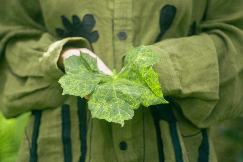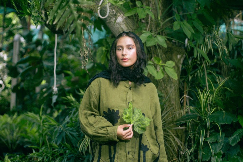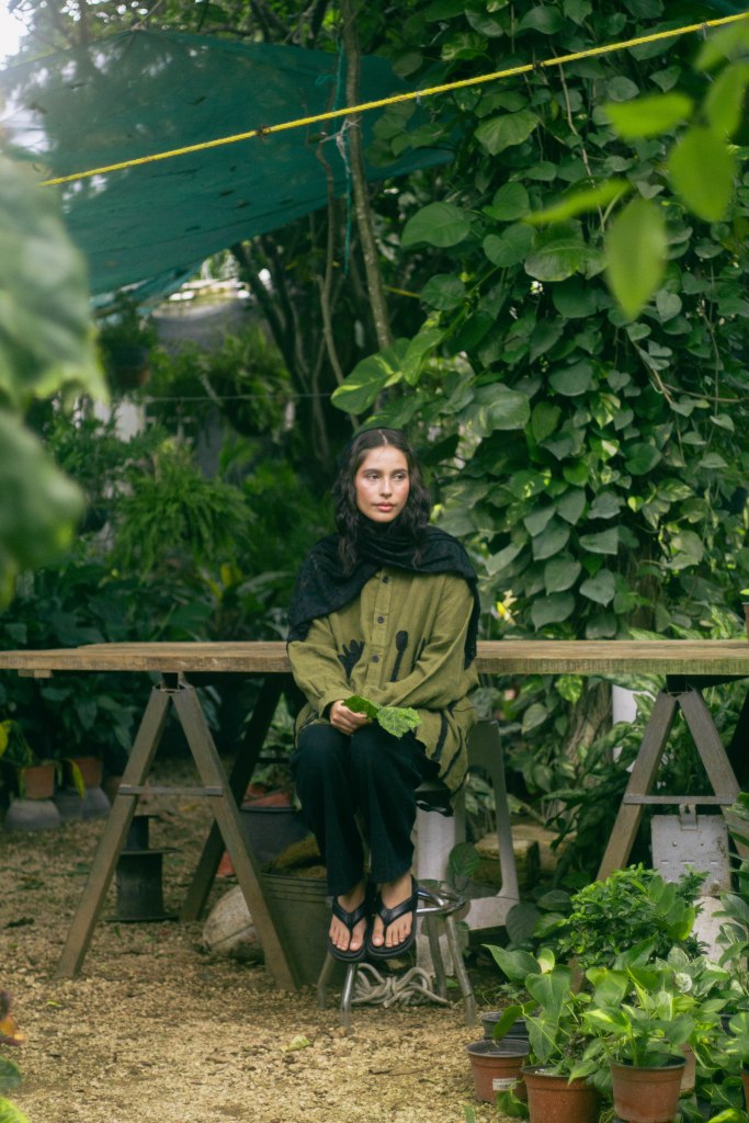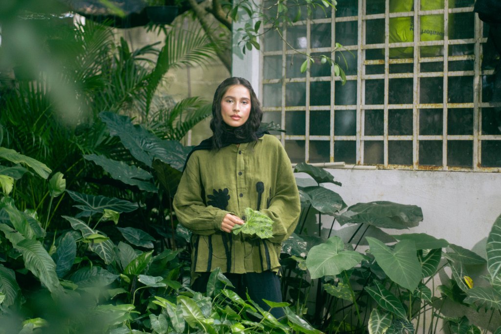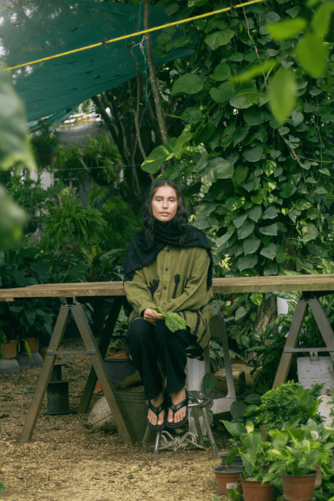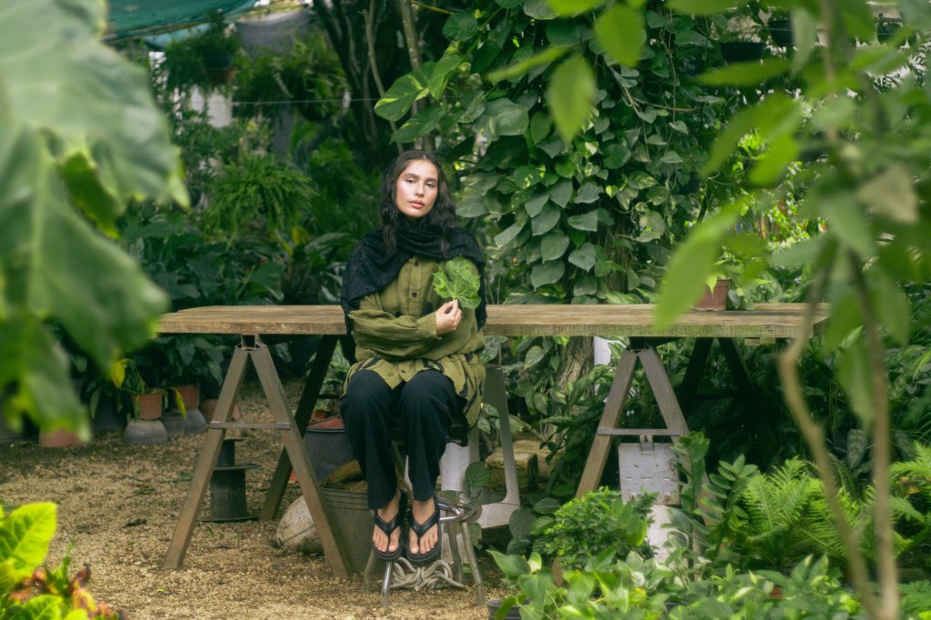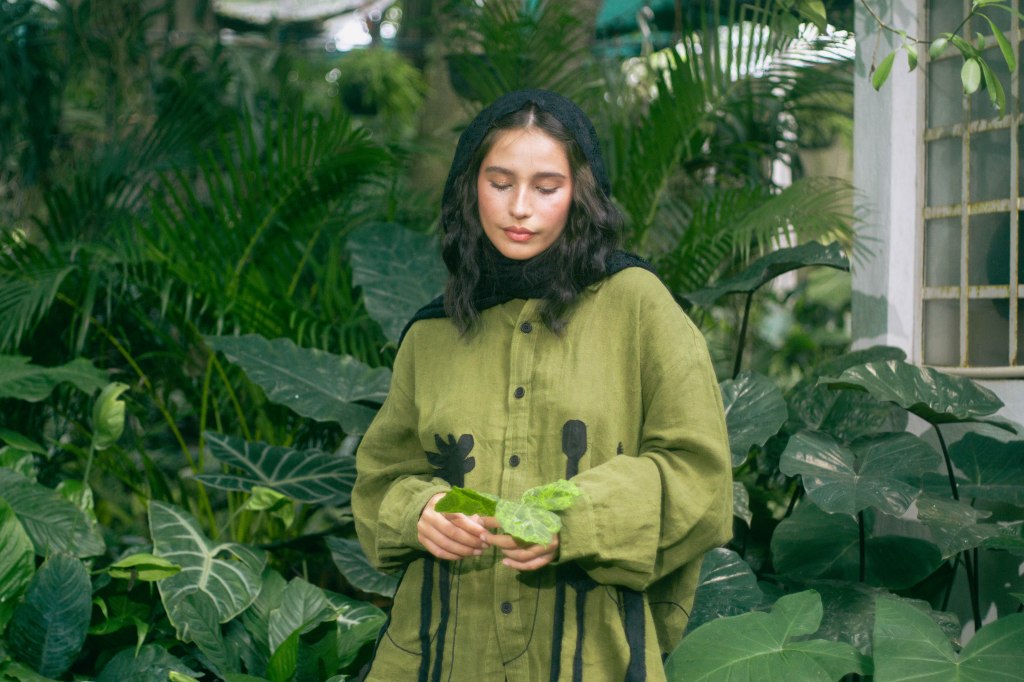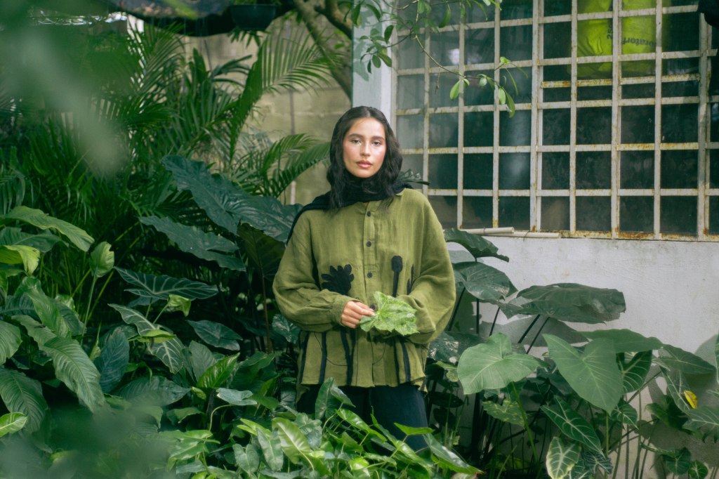 La idea fue centrarla a ella al momento de encuadrar y enmarcarla con las hojas en primer plano, para tenerla siempre rodeada de verde, como si la envolviera y ella fuera parte de la naturaleza. Con esta misma intención escogí que la prenda principal, la camisa verde con detalles negros en forma de plantas, para ayudar a que el personaje no contrastara con el escenario sino que se volviera parte de él. El look completo debía verse editorial pero no elegante o extravagante, sino que fuera la versión de algo que se pondría para salir a trabajar el jardín, con el toque extra del pañuelo en la cabeza para hacer referencia a otro tiempo.