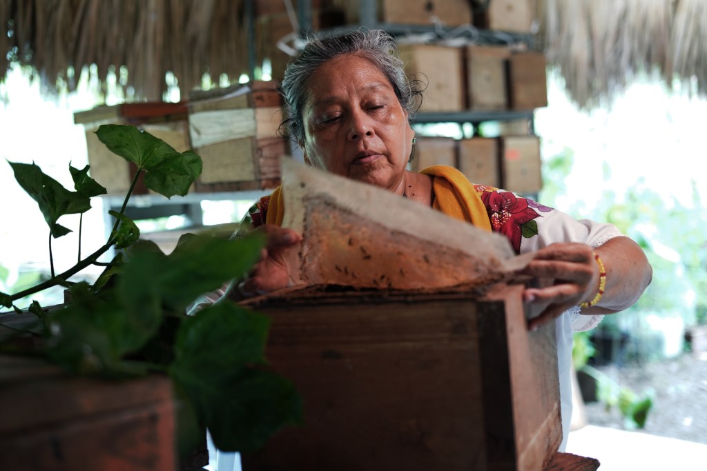 Una nube de abejas meliponas cuelga sobre la cabeza de Anselma Chalé Euan; la siguen a donde vaya. Las acaricia, mientras posan y bailan en su mano izquierda, sin morderla. La mujer ha creado un “santuario” en la subcomisaría de Xcunyá, al norte de la ciudad de Mérida. Un lugar verde, que alberga un huerto con plantas medicinales, junto a cientos de abejas sin aguijón.